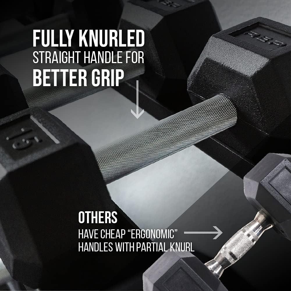 REP Fitness Rubber Hex Dumbbell Set, Adjustable Weight Pairs, Home Gym Equipment, Strength Training For Men Women, Black Coated Grips, Workout Rack Storage Optional, Heavy Lb Free Weights(5-50 lb set Red rack)