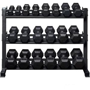 REP Fitness Urethane Coated Round Dumbbells, 5 to 100 lbs, Singles or Pairs, With or Without Rack, Steel Core, Rubber Encased, Chrome Handles, Professional Weights for Home Gym Strength Training(5-50 lb set with 3 Tier Rack)