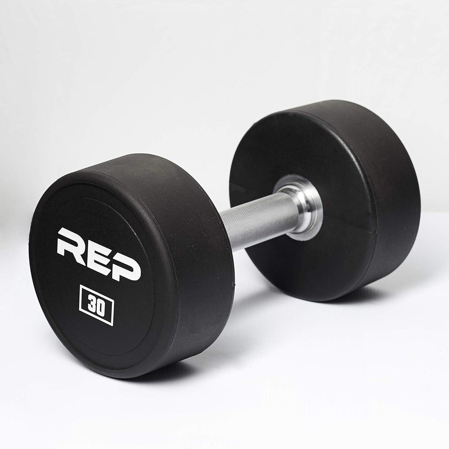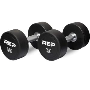 REP Fitness Urethane Coated Round Dumbbells, 5 to 100 lbs, Singles or Pairs, With or Without Rack, Steel Core, Rubber Encased, Chrome Handles, Professional Weights for Home Gym Strength Training(30 lb Pair)