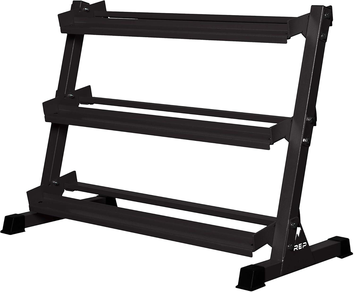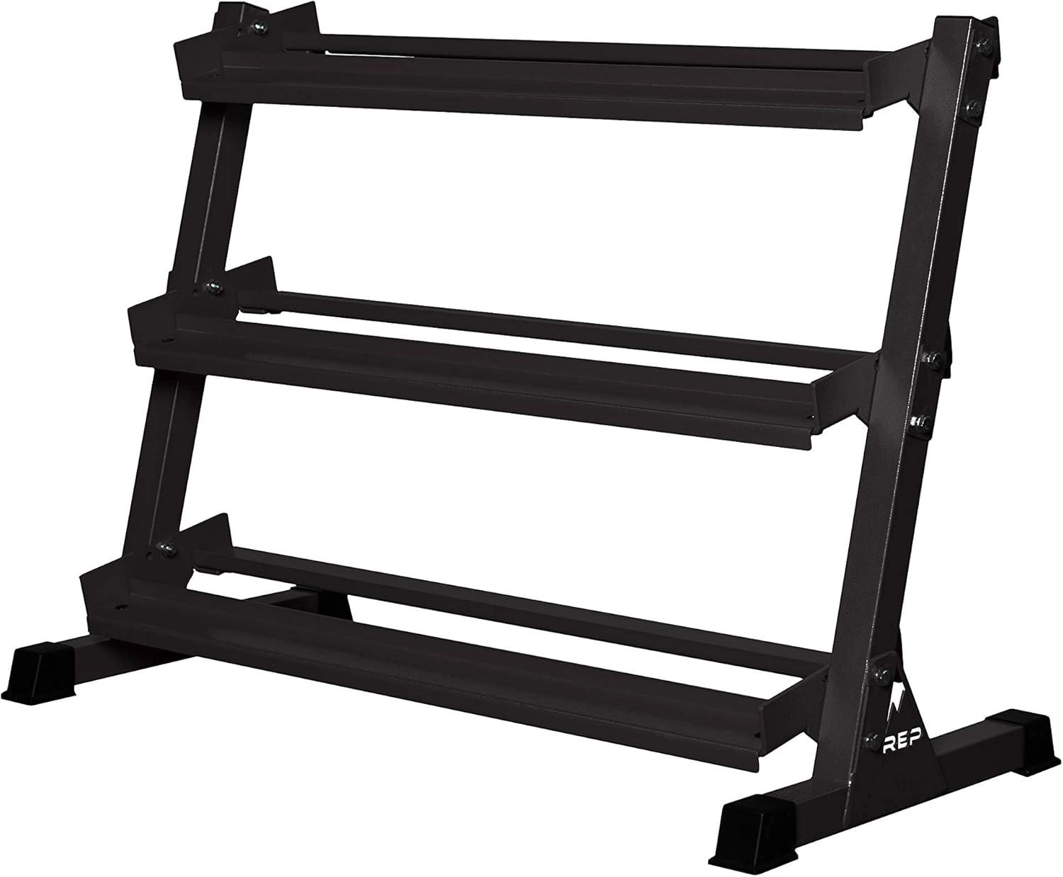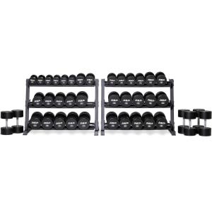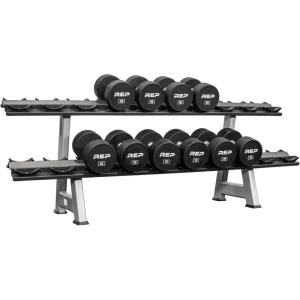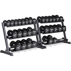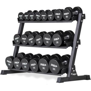 REP Fitness Urethane Coated Round Dumbbells, 5 to 100 lbs, Singles or Pairs, With or Without Rack, Steel Core, Rubber Encased, Chrome Handles, Professional Weights for Home Gym Strength Training(5-100 lb set with 3 Tier Rack)