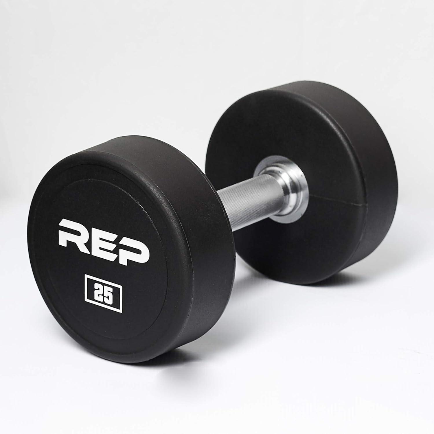 REP Fitness Urethane Coated Round Dumbbells, 5 to 100 lbs, Singles or Pairs, With or Without Rack, Steel Core, Rubber Encased, Chrome Handles, Professional Weights for Home Gym Strength Training(25 lb Pair)