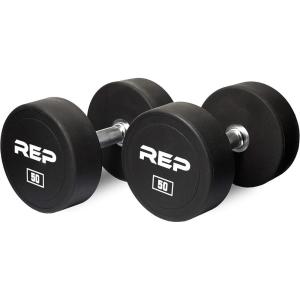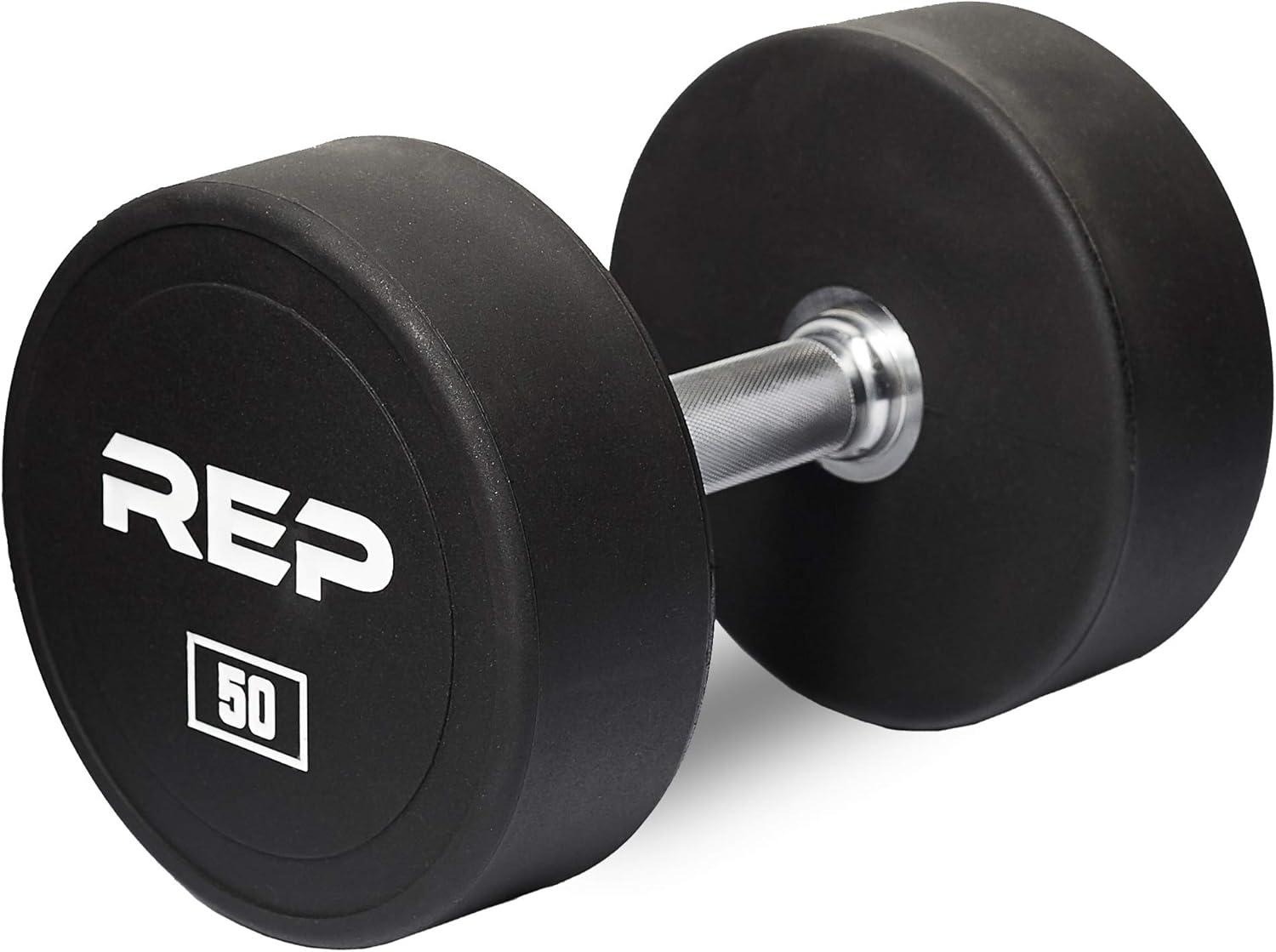 REP Fitness Urethane Coated Round Dumbbells, 5 to 100 lbs, Singles or Pairs, With or Without Rack, Steel Core, Rubber Encased, Chrome Handles, Professional Weights for Home Gym Strength Training(50 lb Pair)