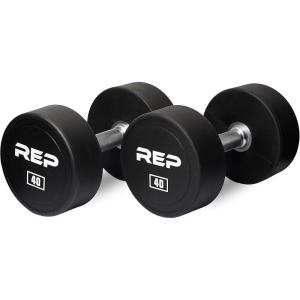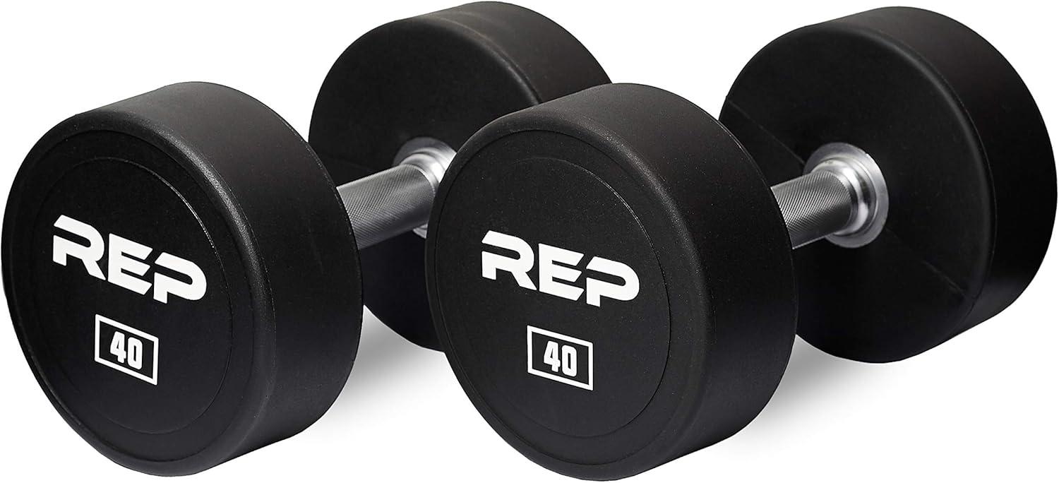 REP Fitness Urethane Coated Round Dumbbells, 5 to 100 lbs, Singles or Pairs, With or Without Rack, Steel Core, Rubber Encased, Chrome Handles, Professional Weights for Home Gym Strength Training(40 lb Pair)