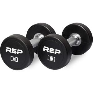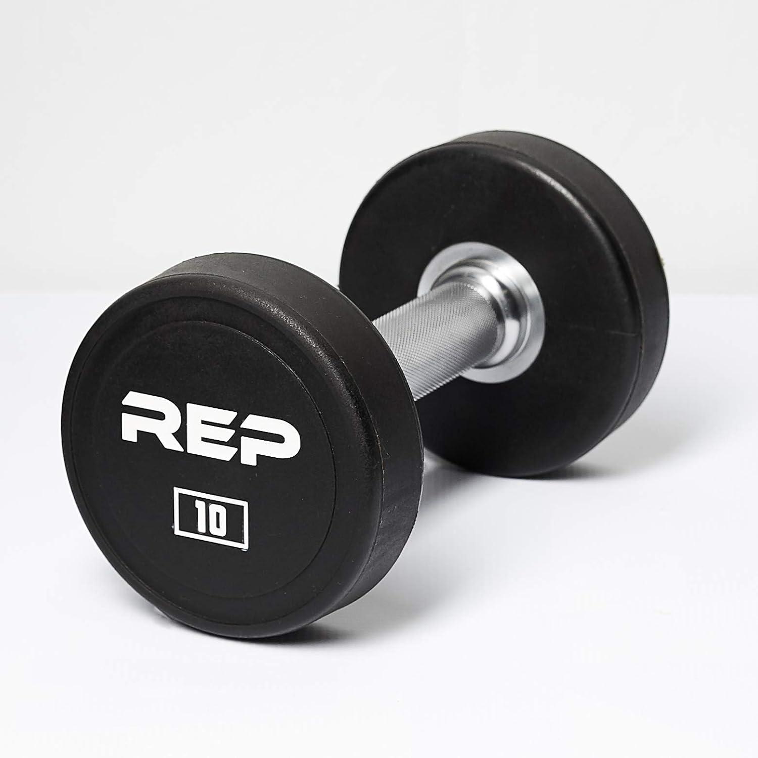 REP Fitness Urethane Coated Round Dumbbells, 5 to 100 lbs, Singles or Pairs, With or Without Rack, Steel Core, Rubber Encased, Chrome Handles, Professional Weights for Home Gym Strength Training(10 lb Pair)