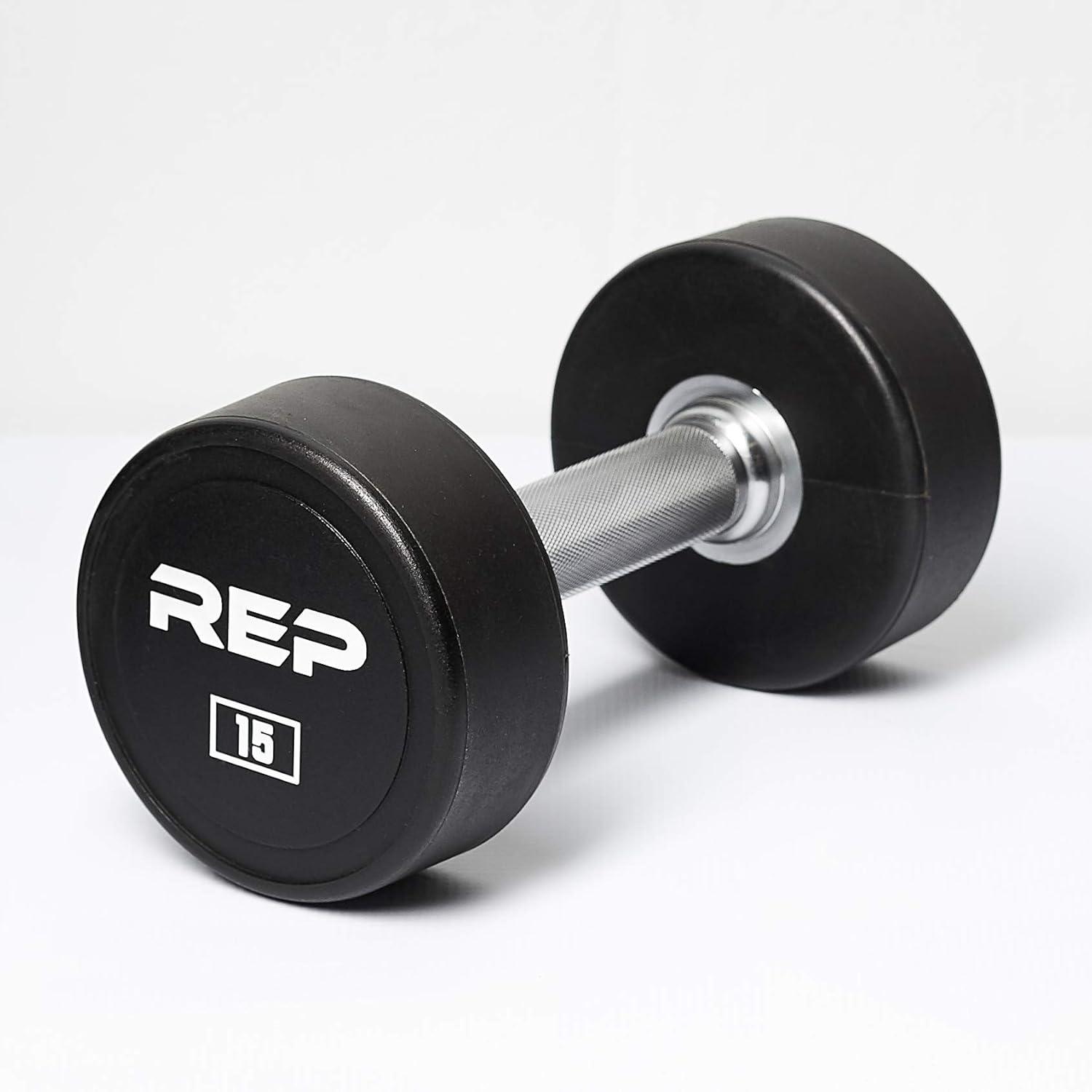 REP Fitness Urethane Coated Round Dumbbells, 5 to 100 lbs, Singles or Pairs, With or Without Rack, Steel Core, Rubber Encased, Chrome Handles, Professional Weights for Home Gym Strength Training(15 lb Pair)