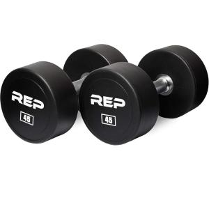 REP Fitness Urethane Coated Round Dumbbells, 5 to 100 lbs, Singles or Pairs, With or Without Rack, Steel Core, Rubber Encased, Chrome Handles, Professional Weights for Home Gym Strength Training(45 lb Pair)