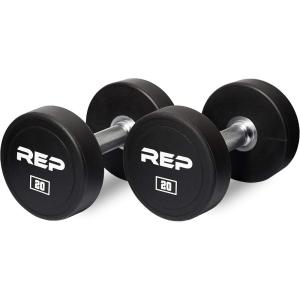 REP Fitness Urethane Coated Round Dumbbells, 5 to 100 lbs, Singles or Pairs, With or Without Rack, Steel Core, Rubber Encased, Chrome Handles, Professional Weights for Home Gym Strength Training(20lb Pair)